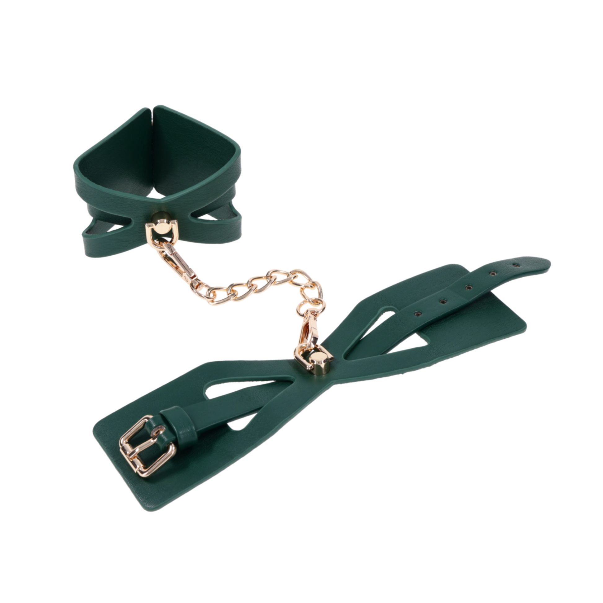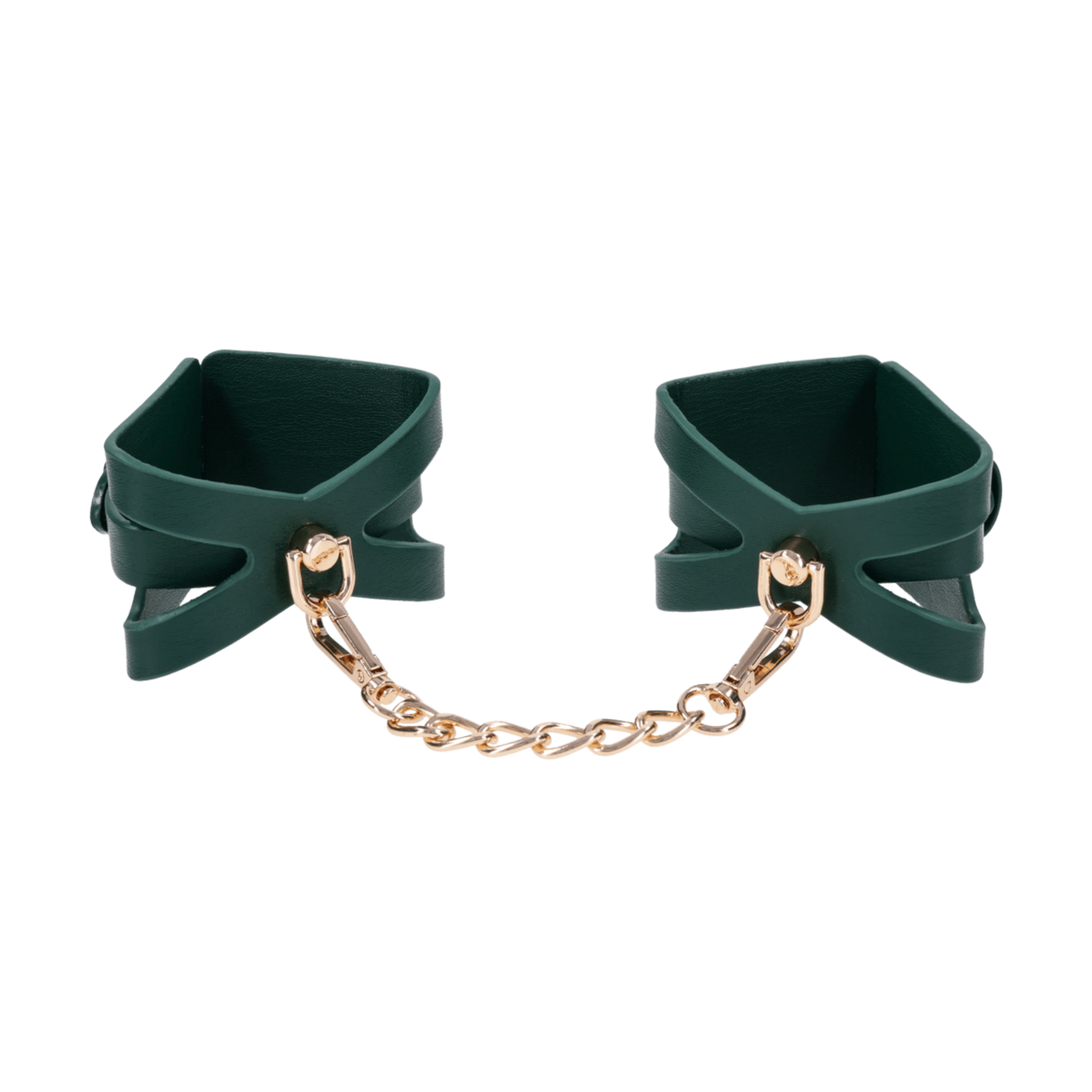 Get wrapped up in something irresistible. These emerald green cuffs feature dramatic cutout detailing to reveal more skin and spark more intrigue. Lined for softness and designed for visual seduction, they’re as comfortable as they are commanding. Use them to bind wrists together or attach to other Indica items for a coordinated scene. The gold chain and hardware add just the right touch of luxury to every surrender.