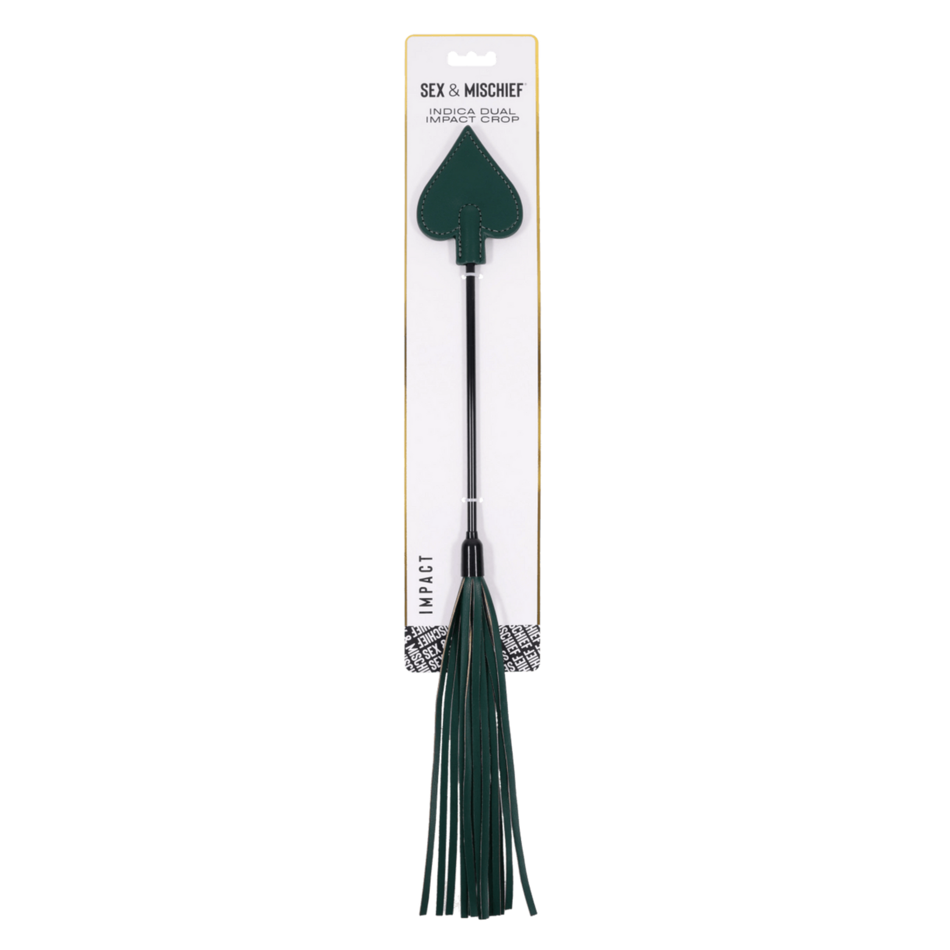 Two sensations. One seductive toy. The Indica Dual Impact Crop features a firm spade tip for crisp slaps and faux leather falls for a teasing sting. Start slow with a gentle flick or turn up the intensity—this versatile crop invites you to explore a full range of impact play. Its emerald green design and gold detailing make every scene feel like a special occasion.