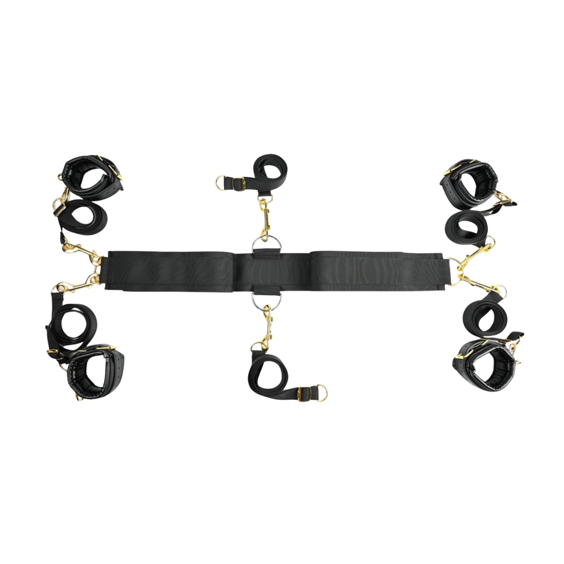 This Special Edition of our top selling Under the Bed Restraints takes play to another level. Easily incorporate your favorite restraint products utilizing the two additional restraint straps, now totaling six. Comfort with style is apparent with the addition of golden hardware including six durable, double sided clasps. Incorporate the lush soft blindfold to add anticipation to play. To use, simply slide the straps underneath your mattress for an instant bondage bedroom. Position the straps around the head of the mattress or around the sides.